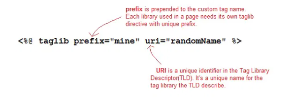<%@ taglib prefix="prefixOfTag" uri="uriOfTagLibrary" %>The prefix is used to distinguish the custom tag from other libary custom tag. Prefix is prepended to the custom tag name. Every custom tag must have a prefix.