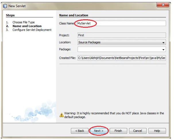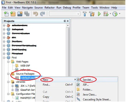6. To create a Servlet, open Source Package, right click on default packages -> New -> Servlet.
