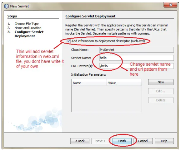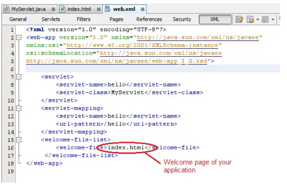 13. Edit web.xml file. In the web.xml file you can see, we have specified the url-pattern and the servlet-name, this means when hello url is accessed our Servlet file will be executed.