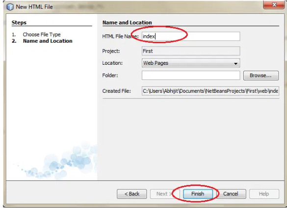 11. Give it a name. We recommend you to name it index, because browser will always pick up the index.html file automatically from a directory. Index file is read as the first page of the web application