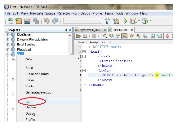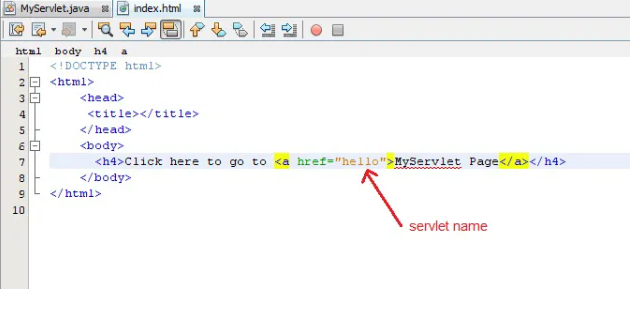 12. Write some code inside your HTML file. We have created a hyperlink to our Servlet in our HTML file.